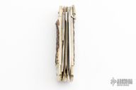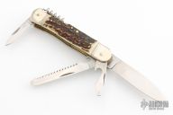 This Stag Multiblade Leverlock by Hubertus has a mirror polished blade, a mirror polished stainless steel clip point blade with nail nick, a mirror polished bottle opener/ flat head screwdriver, cork screw. Scales are stag antler over brass liners, stainless steel back spacer(s), and nickel silver bolsters. Excellent condition. Comes with original box.