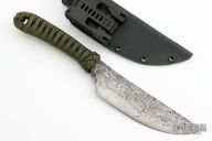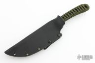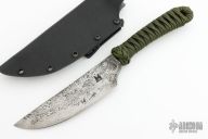 This knife by James Helm features a hand forged blade, .187" blade stock and 1.653" blade depth, hidden tang construction. The handle has a paracord wrap that has been epoxied. Comes with a kydex sheath with TekLok. Comes with a zippered case. Excellent condition.