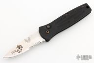 This 3550 Mel Pardue designed side opening auto from Benchmade has a satin finished spear point partially serrated blade with a false top edge. Handle is matte black finished aluminum with milled contours, spine-thumb safety button, black stainless steel tip down clip, and lanyard hole. Includes the original box and papers. Excellent Condition.