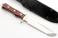 This Diver by Martin Knives features a satin finished spear point blade with sharpened top edge, .221" blade stock and 1.238" blade depth, full tang construction. The handle has a nickel silver guard, red linen micarta grip, extended tang with lanyard hole. Comes with black leather sheath. #07 on choil and back of sheath. Excellent condition.