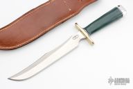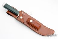 This Fighter by Martin Knives features a satin finished clip point blade with sharpened top edge, .203" blade stock and 1.185" blade depth, hidden tang construction. The handle has a nickel silver guard, green G-10 grip with aluminum/black spacers and an aluminum butt with lanyard hole. Comes with brown leather sheath. #06 on choil and back of sheath. Excellent condition.