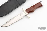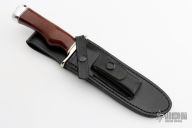 This knife by Martin Knives features a satin finished blade with sharpened top edge, .221" blade stock and 1.204" blade depth, hidden tang construction. The handle has a brass guard, brown canvas micarta grip with red/aluminum/white/blue spacers, has an aluminum butt with lanyard hole. Comes with black leather sheath. #06 on choil and back of sheath. Excellent condition.