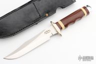 This Fighter by Martin Knives features a satin finished clip point blade with false top edge, .214" blade stock and 1.230" blade depth, hidden tang construction. The handle has a nickel silver guard, red linen micarta grip with ivory paper micarta and black spacers, aluminum butt with lanyard hole. Comes with black leather sheath. #07 on choil and back of sheath. Excellent condition.