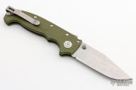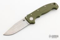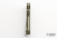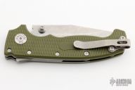 This AD20 by Andrew Demko features a stonewashed drop point blade with dual thumbstuds and a notched thumbrest.   The handle has a Green Grivory frame with a tip up stainless steel clip and "Shark" lock release on the spine. Comes with a Demko box and zippered case. Excellent condition.