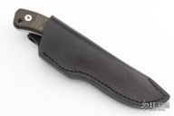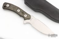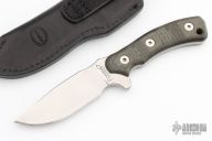 This Peacemaker by Fehrman Knives features a hand rub satin finished blade with a notched thumbrest, .188" blade stock and 1.251" blade depth, full tang construction. The handle has green linen micarta scales. Comes with black leather sheath. #088.  Excellent condition.
