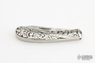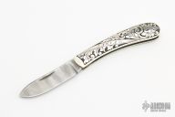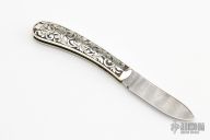 This knife by Jim Corrado was made for the 1985 AKCA. It features a Damascus blade with nail nick. The handle has engraved silver covers, stainless steel spring, has half-stop. Excellent condition.