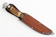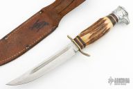 This knife from York Cutlery Co features a satin finished blade with fullers, .163" blade stock and .777" blade depth, hidden tang construction. The handle has a brass guard and aluminum "Eagle" pommel with a stag grip and black/red/white spacers. Includes original brown leather sheath. Has scratches and patina, has been resharpened, otherwise good condition for its age.