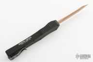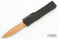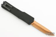 This Cleric OTF by Heretic Knives features a bronze PVD coated blade. The handle has a black aluminum frame with a stepped black stainless steel thumbslide and black stainless steel tip down clip. Comes with original box and papers. Has a couple light scuffs, otherwise excellent condition.