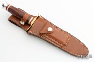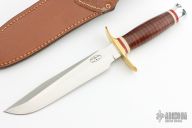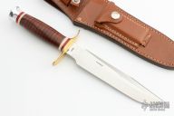 This WWII Springfield Fighter Prototype from Martin Knives features a satin finish clip point blade with sharpened top edge, .207" blade stock and 1.230" blade depth, hidden tang construction. The handle has a brass guard, red G-10 and ivory paper micarta spacers, stacked leather grip and aluminum pommel. Includes original brown leather sheath with a stone. The blade is stamped Prototype. Has a couple scratches, otherwise excellent condition. Dated 07. This is the only one he made with a 7" blade.