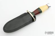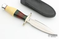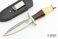 This dagger from Martin Knives features a satin finished double edge blade with .204" blade stock and 1.130" blade depth, hidden tang construction. The handle has a nickel silver guard, aluminum butt, Vietnam Service Ribbon micarta commando style handle with red/white/blue spacers, and ivory paper micarta. Comes with a black leather sheath with clip. Excellent condition.