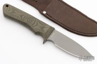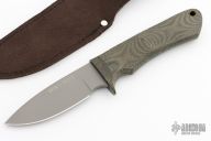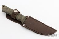 This knife by Allen Blade features a grey coated titanium blade with .168" blade stock and 1.214" blade depth, hidden tang construction. The handle has a black canvas micarta guard and grip with lanyard hole. Comes with a brown leather sheath, not original, but it fits.