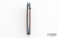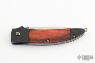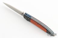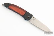 This 480 Shoki Nak-Lok features the unique Nak-Lok that uses tensile strength rather than compression to lock the blade. Bolster button releases blade. Anodized frame with G10 bolsters and wood scales. Comes with leather pouch with clip and original box and papers. Has some light scratches, otherwise excellent condition.