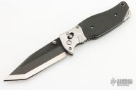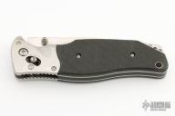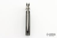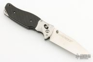 This SOG TomCat Axis Lock Folder has a VG-10 and Carbon Fiber composite chisel ground tanto/ clip point blade with dual thumb studs. Handle is black carbon fiber with satin finished stainless steel bolsters over stainless steel frame with notched thumb rest and black fiber back spacer. Has lanyard tube pin. Comes with SOG nylon velco sheath and original box and papers. Excellent condition.
