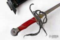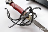 This Avatar Series Sword by Daniel Watson of Angel Sword features a Techno-Wootz Damascus double edged blade with fileworked ricasso, .098" blade stock and .950" blade depth, hidden tang construction. The handle has a forged and blackened steel guard, fluted dymondwood grip, fluted bronze spacers, the top one has 16 rubys and the bottom has 8, and a darkened steel butt with etchings. The blade is very flexible and sharp. Comes with a black leather sheath. Beautiful sword. Excellent condition.
