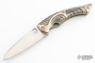 This linerlock folder by Mikkel Willumsen features a hand rub satin finished blade with thumbhole and textured spine. The handle has carved .925 sterling silver scales carved by STORM, textured/carved titanium liners, carved sterling silver backspacer. Nice detent and lockup. Comes with COA and a zippered case. Has a few light scratches, otherwise excellent condition.
