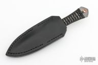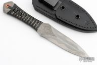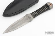 This Forged "Gambler Dagger" by DC Munroe features a hand rub satin finished double edged San Mai Damascus blade with forge finished flats, .180" blade stock, and 1.168" blade depth with full tang construction. The handle has a black leather wrap, copper lanyard hole. Has a Munroe Metalworks stamp in the ricasso. Comes with a black leather sheath. Excellent condition.