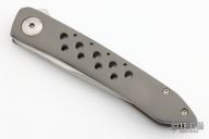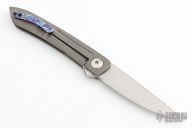 This Anchovy flipper by Kevin Foster features a hand rub satin finished blade with swedge and notched flipper. The handle has a bead blasted titanium frame, tip up timascus clip with anodized titanium screws. Nice detent, lockup and blade seating. Rides on bearings. Has a light scuff on the frame, otheriwse excellent condition.