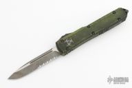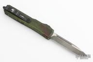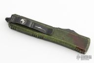 This Ultratech OTF automatic by Microtech features a S/E black blade with a partially serrated edge. Distressed green aluminum contoured frame with black hardware and tip down stainless steel clip. Dated 10/2021 and s/n 029. Includes original box and papers. Excellent condition.