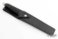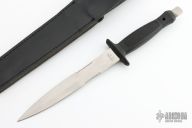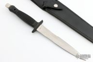 This vintage dagger by Valor features a satin finished double edged partially serrated blade with .196" blade stock and .950" blade depth, hidden tang construction with a black rubber grip. Comes with a black leather sheath. Has some scratches, otherwise excellent condition.