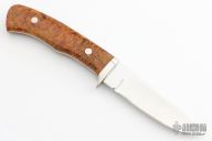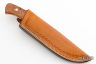 "I have been a knife maker since 1983. I got my start watching George Herron in his shop. He has always been a mentor, answering all of my questions and helping with the little problems of knifemaking. Most of my work is geared toward hunters. Since the most important part of the hunt is not the gun, no matter how much it costs, but a knife that will get the job done comfortably and quickly. I also build a few boots and fighters. All blades are ATS-34 that are professionally heat-treated to a Rockwell 59. All guards, bolsters, and pins are 303 Stainless. All knives are serial numbered. The sheaths are pouch type and are wet-formed to fit each knife."