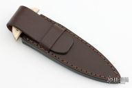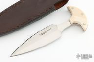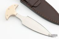 We have made This A.G. Russell Shopmade push dagger letter openers with both giraffe bone scales. Push Daggers were highly favored by gamblers on the early riverboats and in the gold fields of California and Nevada, where they were carried concealed, usually along with a derringer, as protection. Ours was designed for a much less adventurous life. Along with the elegant, deep chocolate brown leather sheath, you’ll not find a letter opener that will generate more interest. The knives are made in our own shop here in Rogers, Arkansas and are marked A.G. Russell™ Shopmade®. The blades are 154CM at 57-59 Rc. The mammoth ivory scales are held in place by mosaic pins and red liners. The leather desktop sheath is made offshore to our design. Excellent condition.