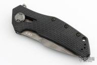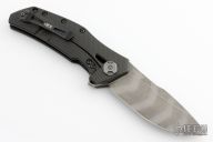 The ZT 0308BKLTS is a beefy tactical folder with everything you'd expect from a ZT going for it. It's made of a black G-10 handle with a titanium frame lock, and DLC coating. The blade is made of CPM-20CV steel with black oxide BlackWash, and is finished with tiger stripes. The handle has texture that provides a sure grip, but won't chew up your hand or your pocket. The profile of the handle and blade facilitate comfortable ergonomics and safe hard use. s/n 1038. Comes with original box and papers. Has a couple scratches on the pivot, otherwise excellent condition.