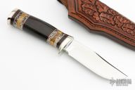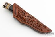 Randy’s fascination with knives began as a young man when he made his first knife in a high school “metals” class. He collected them for years and eventually began making his own to get a better edge-holding skinner for hunting. Randy read books and visited local makers to learn the craft. In 1979, he decided to invest in shop equipment so that he could properly master his knife making skills. In a few years, he was making and selling knives to local hunters, while continually developing his style and craftsmanship. He attended his first knife show in 1986 and has been participating in about six shows each year since then. As an avid hunter, Randy knows how a good hunting knife should perform. He loves to “field-test” his designs and feels that a quality knife should not only look great, but perform well as a tool. He offers a wide variety of knife styles; from utility hunters and fighters to collector pieces such as daggers and bowies. Although the actual work of grinding and buffing knives is very tedious, he always finds it rewarding to see the final finished product. Randy particularly enjoys meeting people who find knives as interesting and exciting as he does. Randy’s wife, Sonja Lee, is one of the premier sheath makers in the business. Using exotic hides, or leather and various forms of tooling, she has mastered the craft of sheath making. Sonja creates the custom sheaths which are provided for each of Randy Lee’s knives and she is now making custom sheaths for many other knife makers and collectors.