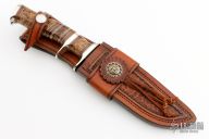 Randy’s fascination with knives began as a young man when he made his first knife in a high school “metals” class. He collected them for years and eventually began making his own to get a better edge-holding skinner for hunting. Randy read books and visited local makers to learn the craft. In 1979, he decided to invest in shop equipment so that he could properly master his knife making skills. In a few years, he was making and selling knives to local hunters, while continually developing his style and craftsmanship. He attended his first knife show in 1986 and has been participating in about six shows each year since then. As an avid hunter, Randy knows how a good hunting knife should perform. He loves to “field-test” his designs and feels that a quality knife should not only look great, but perform well as a tool. He offers a wide variety of knife styles; from utility hunters and fighters to collector pieces such as daggers and bowies. Although the actual work of grinding and buffing knives is very tedious, he always finds it rewarding to see the final finished product. Randy particularly enjoys meeting people who find knives as interesting and exciting as he does. Randy’s wife, Sonja Lee, is one of the premier sheath makers in the business. Using exotic hides, or leather and various forms of tooling, she has mastered the craft of sheath making. Sonja creates the custom sheaths which are provided for each of Randy Lee’s knives and she is now making custom sheaths for many other knife makers and collectors.