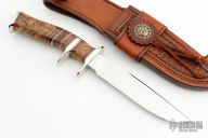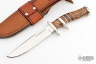 This Sub-Hilt Fighter by Randy Lee features a mirror polished blade with .154" blade stock and 1.141" blade depth, hidden tang construction. The handle has a nickel silver guard, sub-hilt and butt, black ash burl grip, and a spacer pattern consisting of black, nickel silver, brown canvas micarta,stabilized pinecone/acryluster. Comes with a hand tooled brown leather sheath, zippered case and COA. Excellent coniditon.
