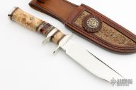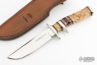 This Sub-Hilt Fighter by Randy Lee features a mirror polished blade with .196" blade stock and 1.279" blade depth, hidden tang construction. The handle has a nickel silver guard, sub-hilt and butt, California Buckeye burl grip, and a spacer pattern consisting of black, nickel silver, ironwood, Oosic , red acryluster. Comes with a hand tooled brown leather sheath, zippered case and COA. Excellent condition.