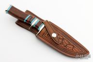 Randy’s fascination with knives began as a young man when he made his first knife in a high school “metals” class. He collected them for years and eventually began making his own to get a better edge-holding skinner for hunting. Randy read books and visited local makers to learn the craft. In 1979, he decided to invest in shop equipment so that he could properly master his knife making skills. In a few years, he was making and selling knives to local hunters, while continually developing his style and craftsmanship. He attended his first knife show in 1986 and has been participating in about six shows each year since then. As an avid hunter, Randy knows how a good hunting knife should perform. He loves to “field-test” his designs and feels that a quality knife should not only look great, but perform well as a tool. He offers a wide variety of knife styles; from utility hunters and fighters to collector pieces such as daggers and bowies. Although the actual work of grinding and buffing knives is very tedious, he always finds it rewarding to see the final finished product. Randy particularly enjoys meeting people who find knives as interesting and exciting as he does. Randy’s wife, Sonja Lee, is one of the premier sheath makers in the business. Using exotic hides, or leather and various forms of tooling, she has mastered the craft of sheath making. Sonja creates the custom sheaths which are provided for each of Randy Lee’s knives and she is now making custom sheaths for many other knife makers and collectors.