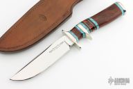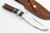 This Sub-Hilt Fighter by Randy Lee features a mirror polished blade with .210" blade stock and 1.306" blade depth, hidden tang construction. The handle has a nickel silver guard, sub-hilt and butt, ironwood grip, and a spacer pattern consisting of black, nickel silver, turquoise, red/black acryluster. Comes with a hand tooled brown leather sheath, zippered case and COA. Excellent condition.