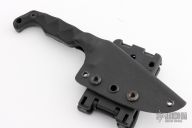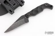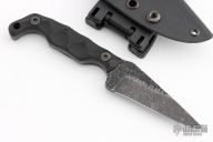 This Mini by Stroup Knives features a dark tumbled clip point blade with sculpted flats and a full tang construction.  .172" Blade Stock.  1.096" Blade Depth.  The handle features sculpted G10 scales.  Includes a kydex sheath with a Tek-Lok.  Includes the original box.  New from Maker!