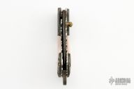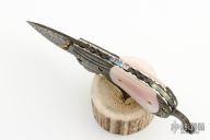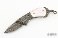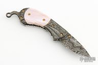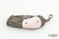 This knife features a Damascus blade with a single brass thumbstud with yellow stone inlay. The handle has  carved Damascus bolsters, pink pearl scales, gold plated screws, Damascus butt, fileworked stainless steel liners, Damascus backspacer with abalone inlays. Excellent condition.