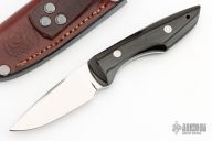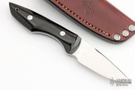 This Lycan by Caleb White features a mirror polished drop point blade with sedge, .144" blade stock and 1.030" blade depth, full tapered tang construction. The handle has black linen micarta scales with steel loveless style pins and sterling silver lanyard tube. Includes leather sheath with belt loop. Excellent condition.