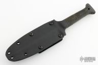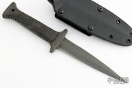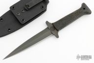 This GBRS Dagger by Winkler Knives features a black double-edged blade with .193" blade stock and 1" blade depth, full tang construction. The handle has micarta scales with black rubber inlays. Comes with a leather lined kydex sheath with belt attachment system. #300. Excellent condition.