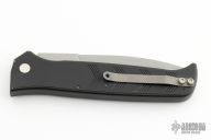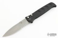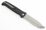 This Militia Auto by Rob Dalton features a bead blast finished partially serrated blade and a black anodized aluminum frame with safety. Titanium clip, tip up carry. Powerful coil spring action. Has some scuffs, otherwise excellent condition. #20172
