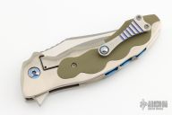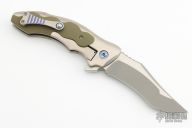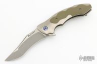 This Pirate Mid Tech Flipper by Allen Elishewitz features a two-tone recurve blade with flipper and notched thumbrest. The handle has a satin finished titanium frame with G-10 inlays, titanium backspacer and tip up clip. Nice detent, lockup and blade seating.  Comes with nylon velcro case.  Excellent Condition.