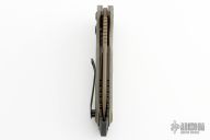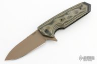 This knife features a tan drop point blade with a notched thumbrest. The handle has G-10 scales over black stainless liners and a composite backspacer. Has black stainless steel liners and pocket clip. Excellent condition.