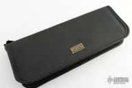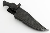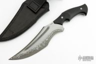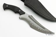 Another gorgeous piece from the Sobral Brothers! This Caiman knife features San Mai steel with false top edge, fullers, .263" blade stock and 2.035 blade depth. Full tang construction. The handle features black g10 scales. Comes with gorgeous custom leather sheath, and leather zipper case. New from maker!