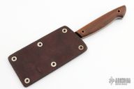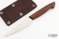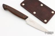This Paring knife by Broco Knives features a hand rub satin finished 14C28N steel blade with .088" blade stock and 1.016" blade depth, full tang construction. The handle has Pau Ferro wood scales with copper pins. Comes with a leather slip sheath and COA. New from maker!