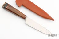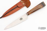 This Argentia Gaucho by JU-CA features a satin finished blade with integral guard, .085" blade stock and .951" blade depth, hidden tang construction. The handle has a horn grip with red/brass/black spacers and a brass butt plate. Comes with a brown leather sheath and zippered case. Excellent condition.