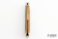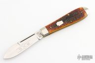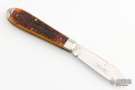 This slipjoint by Schatt & Morgan features a mirror finished blade with nail nick. The handle has nickel silver bolsters, caramel worm groove jigged bone covers, brass liners and stainless steel spring. Has half-stop. Has some light scratches, otherwise excellent condition.