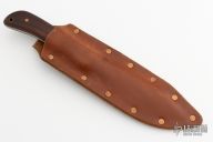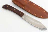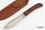 This knife by Jeff Morgan features a hand rub satin finished blade with hamon, .150" blade stock and 1.458" blade depth, full tang construction. The handle has wood scales with brass pins. Comes with brown leather sheath. Has some light scratches and patina, otherwise excellent condition.
