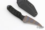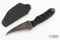 This knife by Joe Watson features a hawk bill titanium blade with carbidized edge, .166" blade stock and 1.459" blade depth, full tang construction. The handle has black cord wrap over black cord under wrap. Comes with a kydex sheath. Excellent condition.