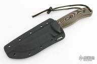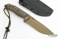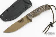 This Esee-5 features an tan coated drop point blade with notched thumbrest, .248" blade stock and 1.603" blade depth. Scales are tan/black G-10. Lanyard bail or skull crusher at but. Comes with kydex sheath and original box sleave. Excellent condition.