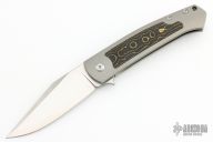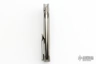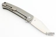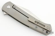 This Pinscher by Monterey Bay Knives is a Raymond Laconico design, it features a ZDP-189 core San Mai blade with flipper. The handle has a bead blasted titanium frame with fat carbon inlay, titanium backspacer, tip up mokuti clip, lanyard hole. Rides on bearings, nice detent, lockup and blade seating. Excellent condition. Comes with a zippered case.