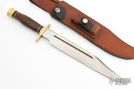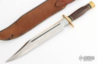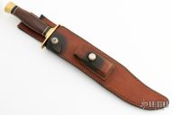 This Classic Bowie by Ralph Bone features a clip point satin finished blade with sharpened top edge, fullers and brass back, .245" blade stock and 1.525" blade depth, hidden tang construction. The handle has a brass guard and butt, cocobolo grip, black and brass spacers. Comes with a brown leather sheath, the keeper of the sheath is broken, and the leather on the stone pouch is torn. Has some light scratches and patina, otherwise good condition. L535. The trademark, along with the first digit of the s/n reveals that it was made in 1965.