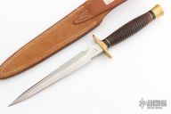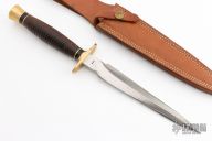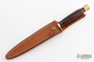 This Model B Dagger by Ralph Bone features a double edged blade, .248" blade stock and .962" blade depth, hidden tang construction. The handle has a brass guard and butt cap, and ribbed cocobolo handle with brass and black spacers. Blade is marked "B 0". Has some light scratches and patina, otherwise good condition. Comes with a brown leather sheath.