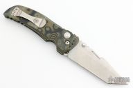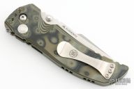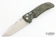 This Hogue/Elishewitz design features a stonewashed tanto blade with dual thumbstuds and notched thumbrest. The handle has milled G-Mascus G10 frame with button lock, safety and tip down carry clip. Excellent condition.